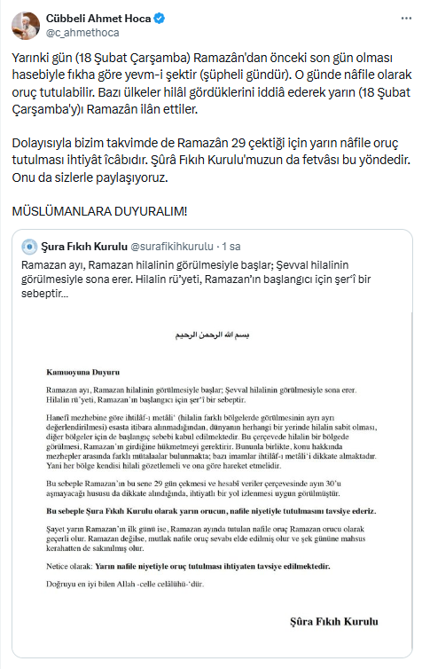 Yarınki gün (18 Şubat Çarşamba) Ramazân'dan önceki son gün olması hasebiyle fıkha göre yevm-i şektir (şüpheli gündür). O günde nâfile olarak oruç tutulabilir. Bazı ülkeler hilâl gördüklerini iddiâ ederek yarın (18 Şubat Çarşamba'y)ı Ramazân ilân ettiler.