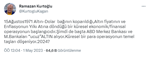 Sosyal medya hesabından bir paylaşımda bulunan Ramazan Kurtoğlu, "15 Ağustos1971 Altın-Dolar bağının koparıldığı, altın fiyatının ve enflasyonun yılki atına döndüğü bir küresel ekonomik/finansal operasyonun başlangıcıdır. Şimdi de başta ABD Merkez Bankası ve Merkez Bankaları “ucuz” altın alıyor. Küresel bir para operasyonun temel taşları döşeniyor. 2024?" dedi.