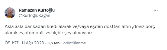 Sosyal medya hesabından bir paylaşımda bulunan Ramazan Kurtoğlu, "Asla asla bankadan kredi alarak ve/veya eşten dosttan altın, döviz borç alarak ev, otomobil vs. hiçbir şey almayınız" dedi.