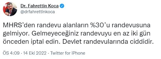“Devlet randevularından ciddidir” diyen Koca, “MHRS’den randevu alanların %30’u randevusuna gelmiyor. Gelmeyeceğiniz randevuyu en az iki gün önceden iptal edin. Devlet randevularında ciddidir” ifadelerini kullandı.
