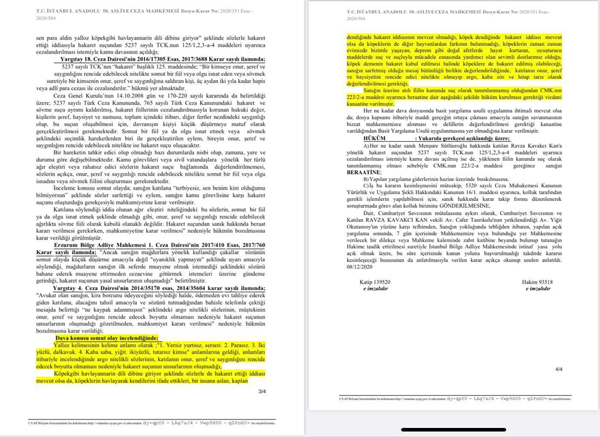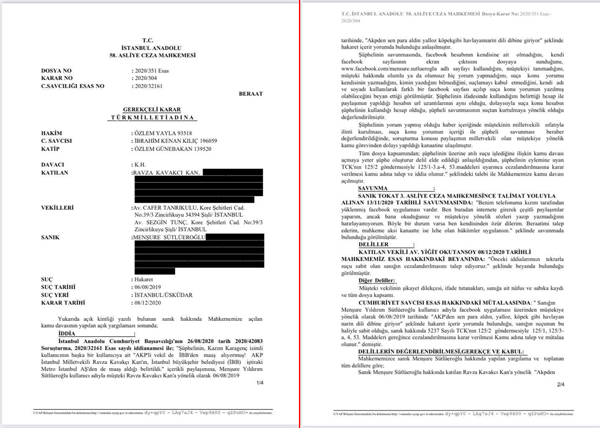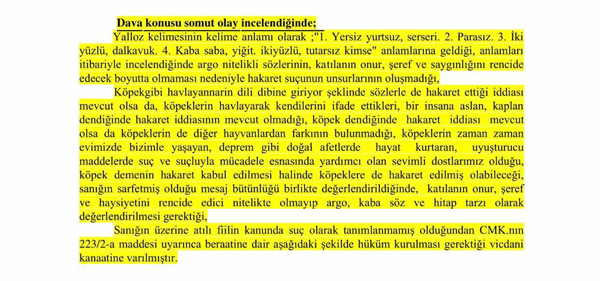 Yapılan hakaretin içeriğini ayrıca yazarak değil, mahkeme kararındaki kısmının görüntüsünü üzülerek ekte tekrar paylaşıyorum. Bu karara karşı her türlü hukuki mücadeleye avukatlarımla birlikte sonuna kadar devam edeceğimizi tekraren kamuoyu ile paylaşmak isterim.
