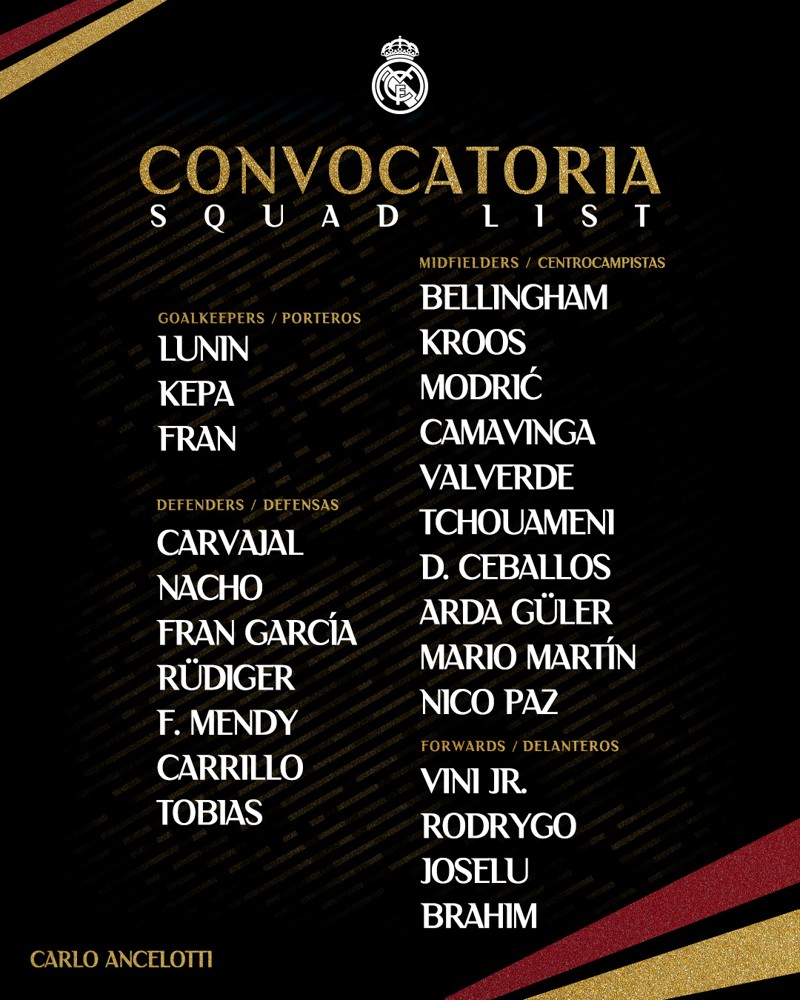 Real Madrid, Atletico Madrid ile oynayacağı Süper Kupa yarı final maçının kadrosunu açıkladı.