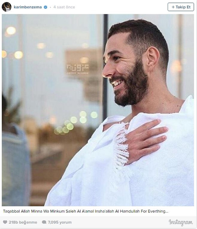 Real Madrid forması giyen Cezayir asıllı Fransız futbolcu Karim Benzema, Umre ziyaretine gittiğini sosyal medya hesabından yaptığı ihramlı fotoğraf paylaşımıyla duyurdu.
