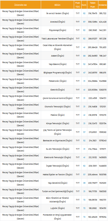 Recep Tayyip Erdoğan Üniversitesi 2 yıllık taban puanları 2021, yüzdelik dilimleri ve kontenjan sayıları kaçtır?
