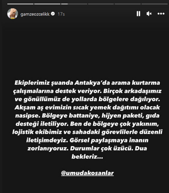 Kurucusu olduğu Umuda Koşanlar Derneği ile çalışmalarını yürüten Gamze Özçelik, deprem bölgeleri için kolları sıvadı. Depremzedeler için yemek yapan Gamze Özçelik, şimdi de 100 adet konteyner yapmaya hazırlanıyor.