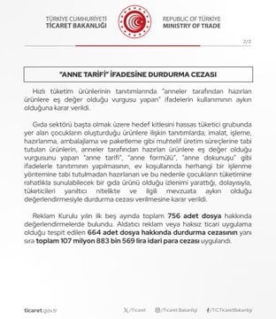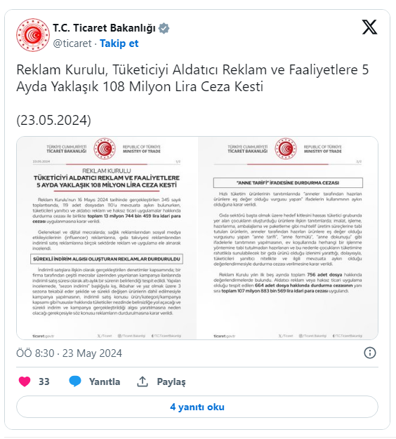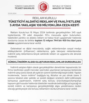 Ticaret Bakanlığı'nın resmi X hesabından yapılan açıklamada, Reklam Kurulu'nun, tüketiciyi aldatıcı reklam ve faaliyetlere 5 ayda yaklaşık 108 milyon lira ceza kestiği duyuruldu.