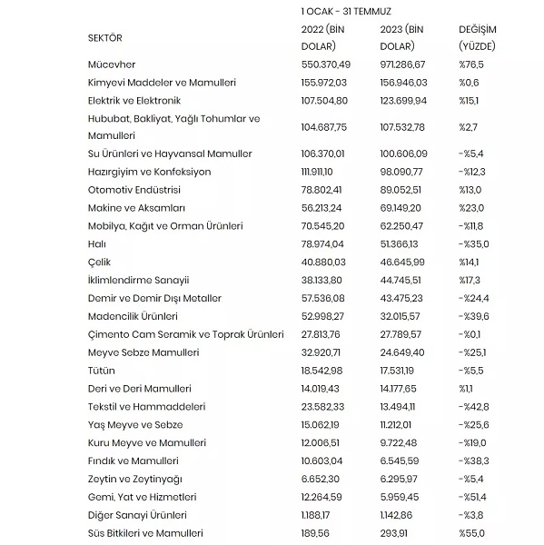 TİM verilerine göre, ocak-temmuz döneminde sektörlerin BAE'ye ihracatı şöyle: