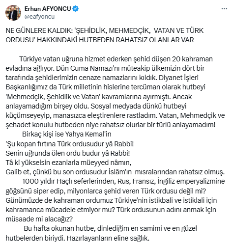 Prof. Dr. Erhan Afyoncu, sosyal medya hesabından konuya ilişkin yaptığı paylaşımda; “Türkiye vatan uğruna hizmet ederken şehit düşen 20 kahraman evladına ağlıyor. Dün Cuma Namazı'nı müteakip ülkemizin dört bir tarafında şehitlerimizin cenaze namazlarını kıldık. Diyanet İşleri Başkanlığımız da Türk milletinin hislerine tercüman olarak hutbeyi 'Mehmetçik, Şehitlik ve Vatan' kavramlarına ayırmıştı. Ancak anlayamadığım bir şey oldu. Sosyal medyada dünkü hutbeyi küçümseyip, manasızca eleştirenlere rastladım. Vatan, Mehmetçik ve şehadet konulu hutbeden niye rahatsız olurlar bir türlü anlayamadım!” ifadelerine yer verdi.