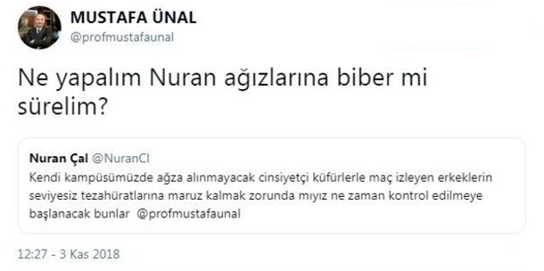 Akdeniz Üniversitesi'nde okuyan bir öğrencisinin sorusuna, "Kendi kampüsümüzde ağza alınmayacak cinsiyetçi küfürle maç izleyen erkeklerin seviyesiz tezahüratlarına maruz kalmak zorunda mıyız? Ne zaman kontrol edilmeye başlanacak bunlar" sözlerine, "Ne yapalım ağızlarına biber mi sürelim" diye cevap veren Rektör Mustafa Ünal'ın bu cevabı, sosyal medyada olay oldu.