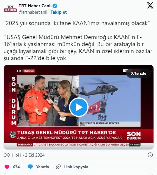 "İlk test uçuşlarımızı yaptık, bu sene bir uçuş daha yapacağız. Ama esas geliştirme test uçuşlarımız seneye başlıyor. Gayet yolunda gidiyor. İnşallah önümüzdeki sene sonunda 2025'de uçuşlarına başlayacaklar. İki tane KAAN'ımız havalanmış olacak. 2028'de de ilk teslimatımızı Hava Kuvvetlerine yapmış bulunuyoruz. Bütün siparişlerimizi vermiş bulunuyoruz. Hazırlıklarımız bu yönde devam ediyor. "