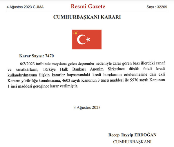 Cumhurbaşkanı Recep Tayyip Erdoğan'ın imzasıyla Resmi Gazete'de yayımlanan karar ile Kahramanmaraş merkezli depremler sonrasında afet bölgesi ilan edilen yerlerde esnaf ve sanatkarlara Halkbank tarafından kullandırılan kredilerin ödemeleri faizsiz 6 ay daha ertelendi.