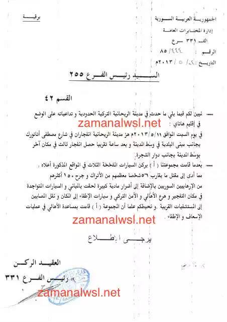 Suriye merkezli Zaman al Wasl haber portalı, iki yıl önce Hatay'ın Reyhanlı ilçesinde düzenlenen bombalı saldırının Suriye istihbaratı tarafından gerçekleştirildiğini kanıtlayan belgelere ulaştı.