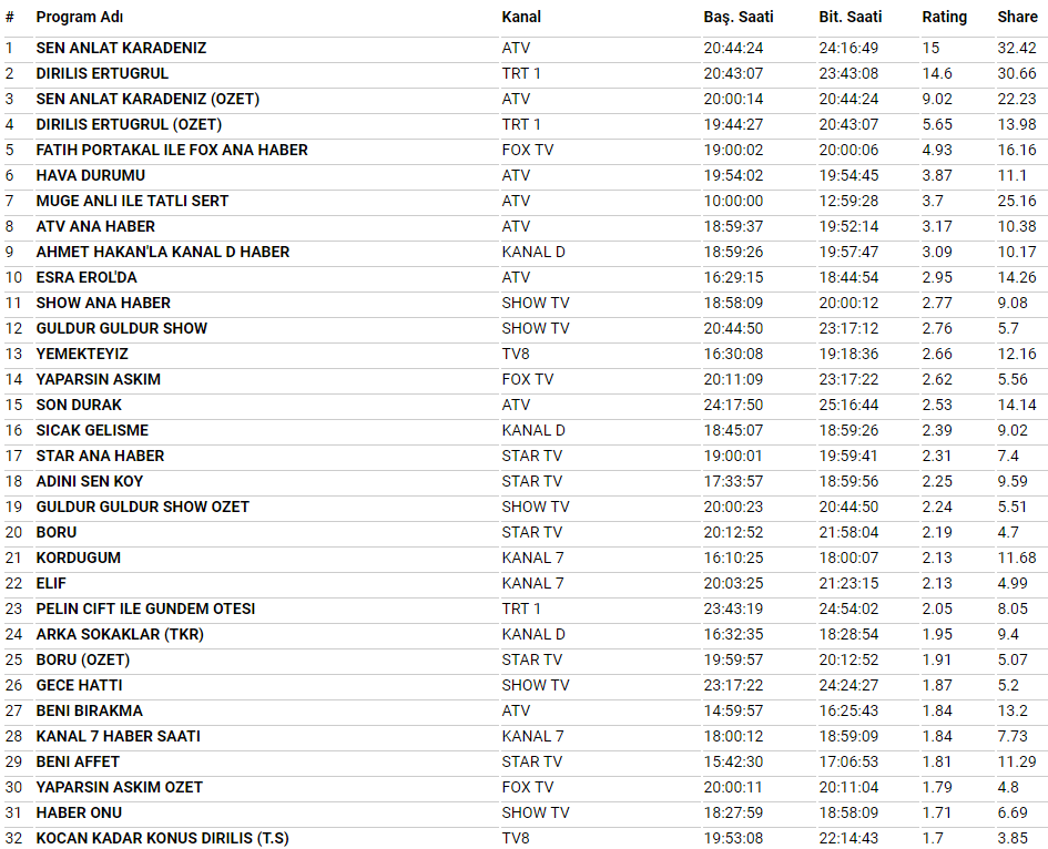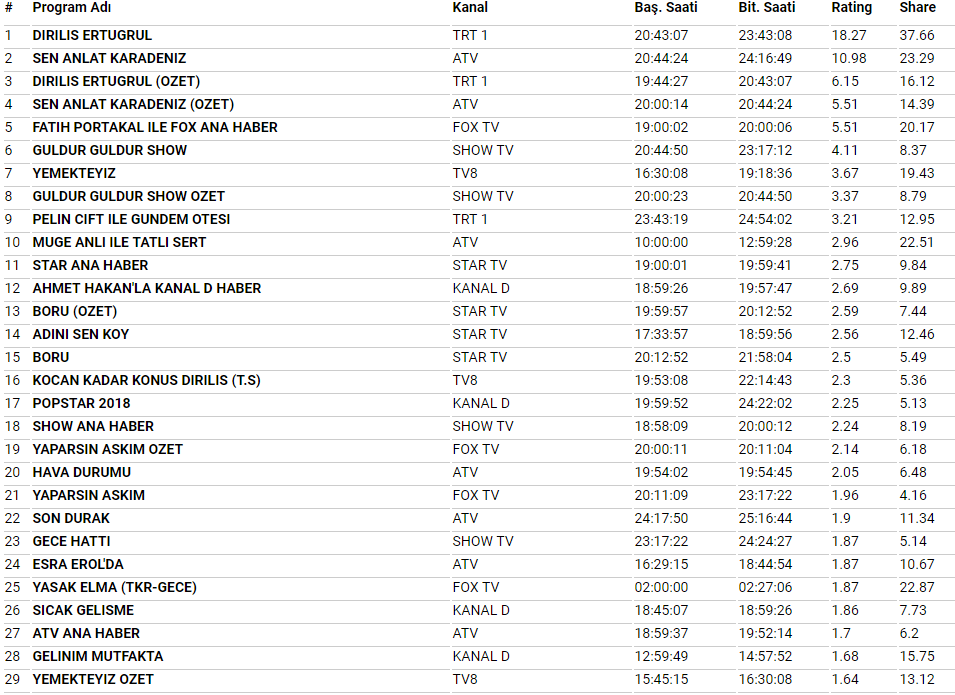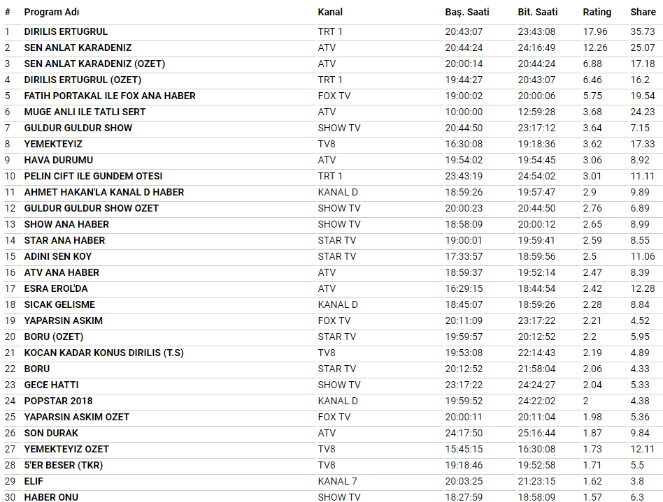 AB'de birincilik Diriliş Ertuğrul'un, ikincilik Sen Anlat Karadeniz'in, üçüncülük ise Diriliş Ertuğrul'un özetinin oldu. Total’de ise ATV'de yayınlanan Sen Anlat Karadeniz dizisi birinci sıraya otururken, TRT 1'de ekrana gelen Diriliş Ertuğrul dizisi az bir farkla ikinci sırada yer aldı.