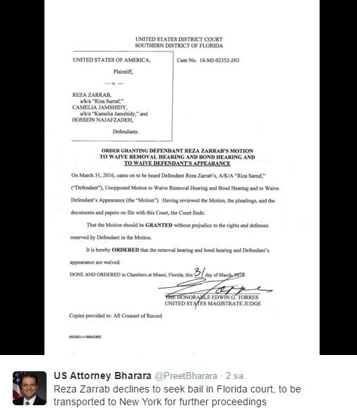 Rıza Sarraf'ın (Reza Zarrab) davasının New York'a transfer edileceği bilgisi Bharara tarafında atılan tweette belirtildi.