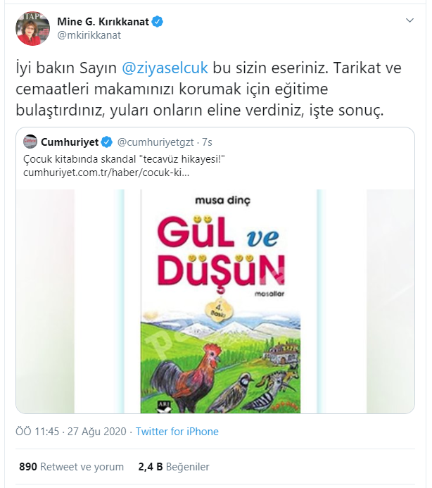 Türkiye’de yaşanan bütün sorunları Müslümanların üzerine yıkarak Kemalizm propagandası ve AK Parti karşıtlığı yapmaya alışan Mine Kırıkkanat, Musa Dinç tarafından yazılan ve kamuoyunda büyük infiale neden olan, “Gül ve Düşün” isimli kitap nedeniyle de Müslümanları hedef aldı. Kitapta tecavüzü meşrulaştıran ifadelere kendince tepki gösteren Kırıkkanat, “İyi bakın Sayın Ziya Selçuk, bu sizin eseriniz.” diye yazdı. Müslümanları hedef gösteren Kırıkkanat, “Tarikat ve cemaatleri makamınızı korumak için eğitime bulaştırdınız, yuları onların eline verdiniz, işte sonuç.” ifadelerini kullandı.