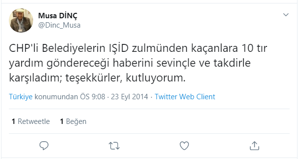 Skandal kitabın yazarı Musa Dinç'in bir twitinde CHP'li belediyelere terör örgütü DAEŞ üzerinden övgüler düzmüştü.