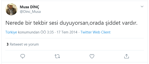 Aynı zamanda Musa Dinç, bir başka twitinde ise Allah'ın yüceliğinin dile getirildiği tekbir sesine de karşı olduğunu gösteren göstermişti.