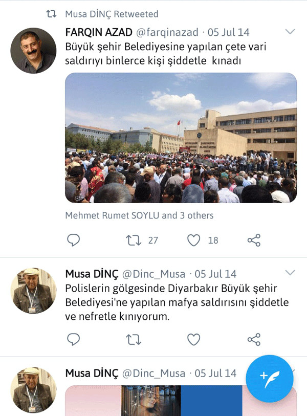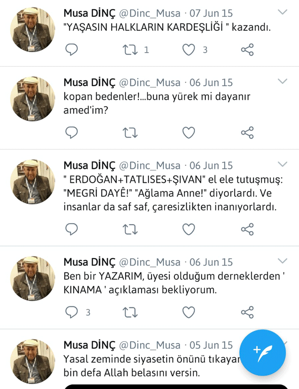 Musa Dinç, bir başka paylaşımda da Kemalistlerin yeni ikiz kardeşi HDP'ye sahip çıkmış ve Diyarbakır Büyükşehir Belediyesi'ne kayyım atanmasına tepki göstermişti.