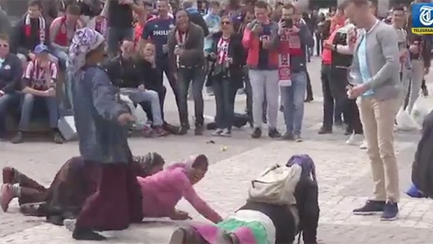 Madrid meydanında oturan ve maç saatini bekleyen PSV taraftarları eğlenmek için çevredeki dilenci kadınları seçti. Sıcak havada, kafede biralarını yudumlayan PSV'liler, dilenci kadınlara para atıp onları bir sağa bir sola koştururken, alınan her para sonrası "oley" çekti. Bununla da yetinmeyen Hollandalılar mültecilere şınav çektirip para verdikleri bardakların içine bira döktü.