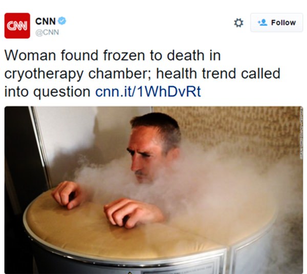 Chelsea Ake-Salvacion isimli kadının Kriyoterapi tankında donarak ölümünü büyük bir hata yaparak Twitter'dan Ribery fotoğrafıyla duyuran CNN, Fransız yıldızın hışmına uğradı. Konudan oldukça rahatsızlık duyan Ribery'nin avukatı Carlos Alberto Brusa, "müvekkilim bu hatadan hiç hoşnut olmadı" ifadelerini kullanırken, konuyla ilgili olarak 1,5 milyon Euro'luk tazminat davası açacaklarını duyurdu.