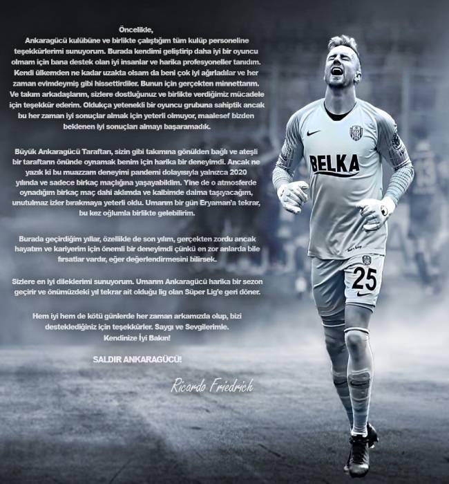 MKE Ankaragücü ile sözleşmesi sona eren 28 yaşındaki kaleci Ricardo Friedrich, veda mesajı paylaştı.