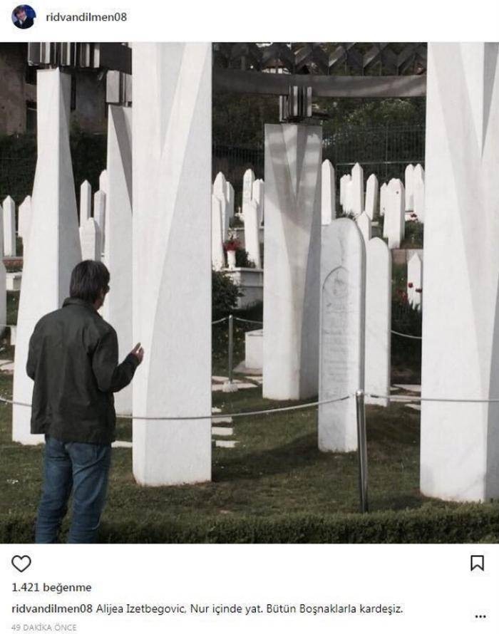 Kütahyalı'ya karşı Rıdvan Dilmen Instagram hesabından yaptığı paylaşımla tepkisini dile getirdi. Dilmen, Aliya İzzetbegoviç'in mezarında dua ederken çekilmiş fotoğrafını paylaştı ve "Bütün Boşnaklarla kardeşiz" diye yazdı.