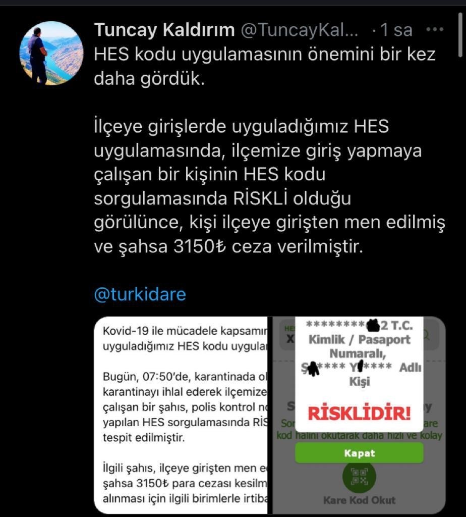 Çüngüş Kaymakamı Tuncay Kaldırım, durumu sosyal medya hesabından paylaşarak, "HES kodu uygulamasının önemini bir kez daha gördük. İlçeye girişlerde uyguladığımız HES uygulamasında, ilçemize giriş yapmaya çalışan bir kişinin HES kodu sorgulamasında riskli olduğu görülünce, kişi ilçeye girişten men edilmiş ve şahsa 3 bin 150 lira ceza verilmiştir" dedi.