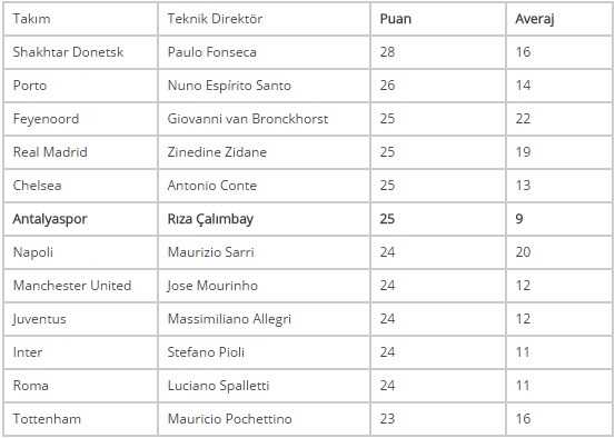 Avrupa'nın en önemli 10 ligi dikkate alındığında da Antalyaspor, yine en iyiler arasında kendine yer buldu. Avrupa'nın en iyi 10 ligi dikkate alındığında Antalyaspor 6. sırada yer aldı. Rıza Çalımbay böylece Jose Mourinho, Stefano Pioli, Massimiliano Allegri, Mauricio Pochettino gibi isimleri geride bırakmayı başardı.