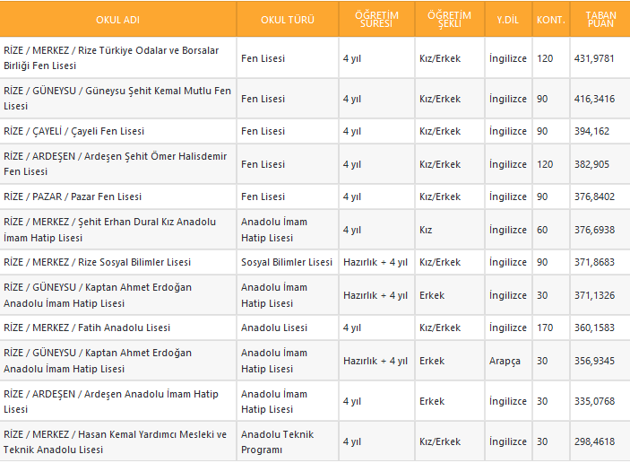 Rize liseleri taban puanı 2021 yüzdelik dilimleri | Rize liseleri kontenjanları