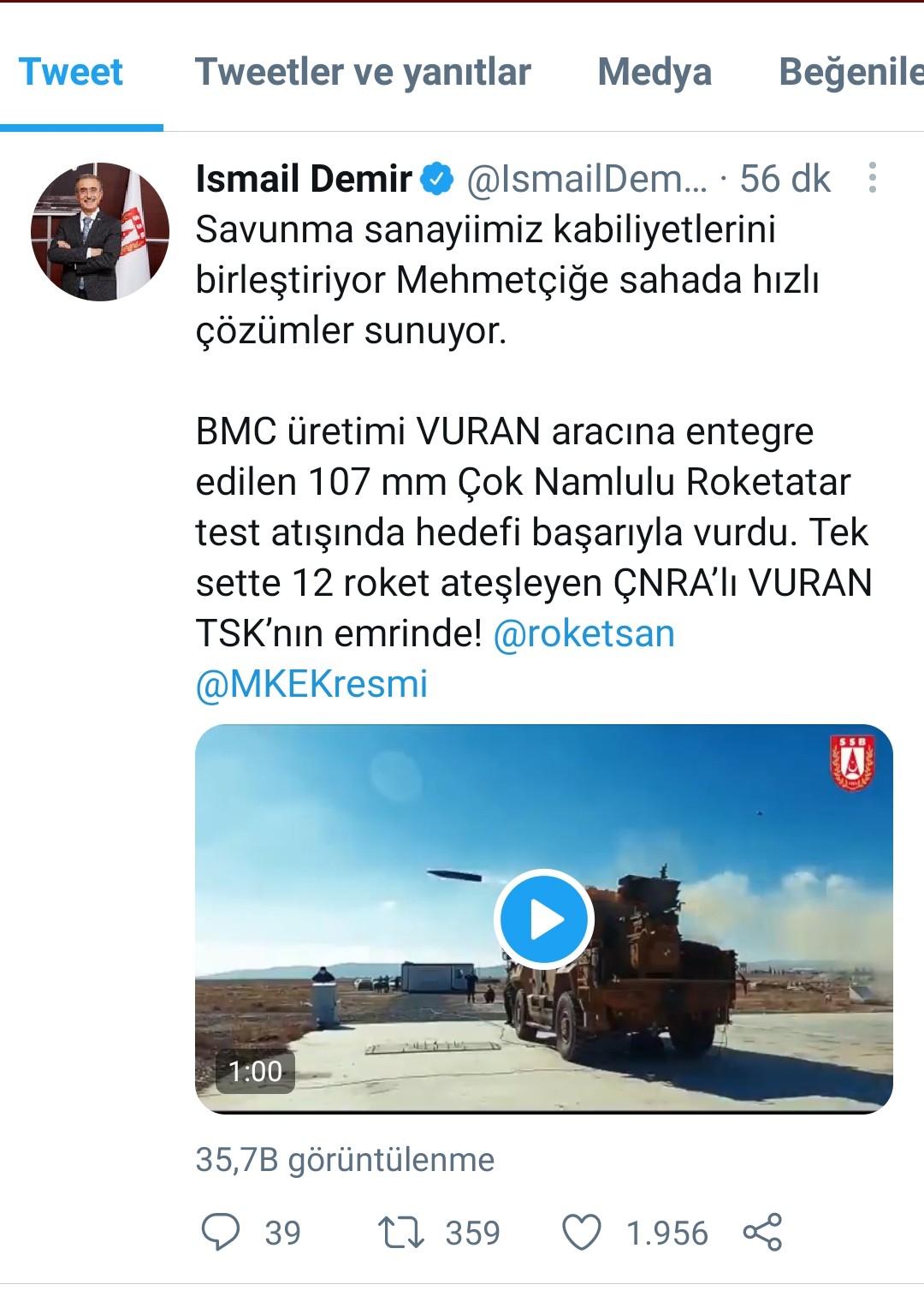 Cumhurbaşkanlığı Savunma Sanayii Başkanı İsmail Demir, BMC üretimi Vuran aracına entegre edilen 107 milimetre Çok Namlulu Roketatar ile ilgili müjdeyi verdi.