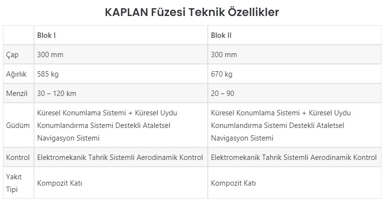 TRG-300 KAPLAN Füzesi, Roketsan tarafından TR-300 KASIRGA Topçu Roketi üzerinden geliştirilmiştir. KAPLAN, Türk Silahlı Kuvvetleri tarafından Irak ve Suriye’ye yönelik icra edilen sınır ötesi harekatlarda aktif olarak kullanılmaktadır. Yaklaşık 120 kilometre menzili bulunan TRG-300 KAPLAN Füzesi, düşük dairesel sapma (CEP) değeri ile kara hedefleri üzerinde güçlü etki oluşturma kabiliyetine sahiptir.