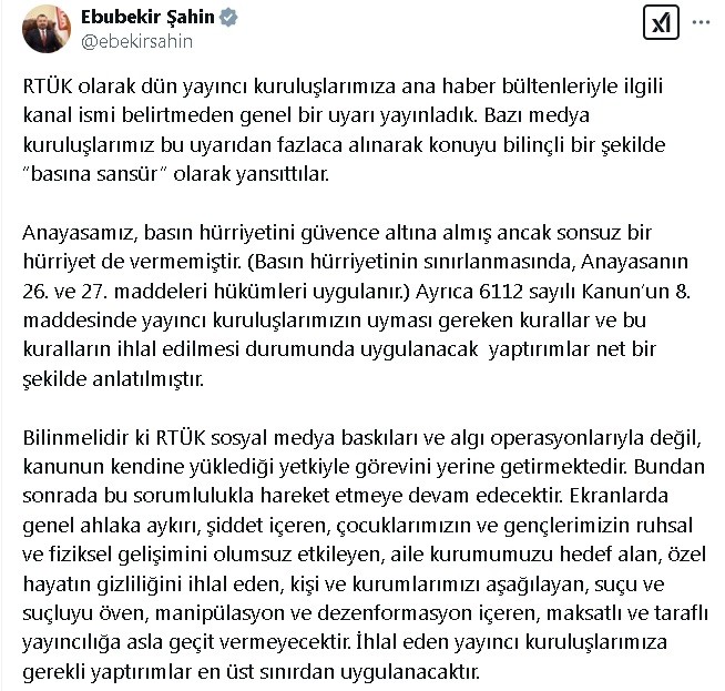 RTÜK Başkanı Ebubekir Şahin, sosyal medya hesabından yaptığı açıklamada, "RTÜK olarak dün yayıncı kuruluşlarımıza ana haber bültenleriyle ilgili kanal ismi belirtmeden genel bir uyarı yayımladık. Bazı medya kuruluşlarımız bu uyarıdan fazlaca alınarak konuyu bilinçli bir şekilde 'basına sansür' olarak yansıttılar. Anayasamız, basın hürriyetini güvence altına almış ancak sonsuz bir hürriyet de vermemiştir. (Basın hürriyetinin sınırlanmasında, Anayasanın 26'ncı ve 27'nci maddeleri hükümleri uygulanır.)" ifadelerine yer verdi.