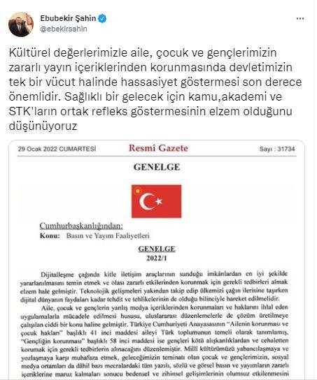Radyo ve Televizyon Üst Kurulu Başkanı Ebubekir Şahin resmi sosyal medya hesabından yaptığı paylaşımda, “Kültürel değerlerimizle aile, çocuk ve gençlerimizin zararlı yayın içeriklerinden korunmasında devletimizin tek bir vücut halinde hassasiyet göstermesi son derece önemlidir. Sağlıklı bir gelecek için kamu,akademi ve STK'ların ortak refleks göstermesinin elzem olduğunu düşünüyoruz” dedi.