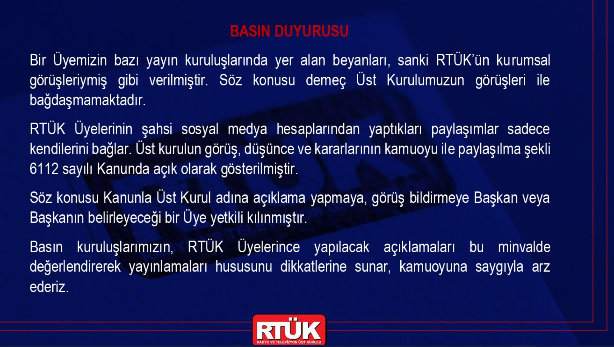 "Söz konusu kanunla Üst Kurul adına açıklama yapmaya, görüş bildirmeye başkan veya başkanın belirleyeceği bir üye yetkili kılınmıştır. Basın kuruluşlarımızın, RTÜK üyelerince yapılacak açıklamaları bu minvalde değerlendirerek yayınlamaları hususunu dikkatlerine sunar, kamuoyuna saygıyla arz ederiz."