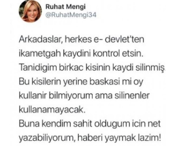 Ruhat Mengi Twitter hesabı üzerinden seçmen kayıtları hakkında şahit olduğunu söylediği bir tweet attı. Mengi "Arkadaşlar, herkes e- devlet'ten ikametgahını kontrol etsin. Tanıdığım birkaç kişinin kaydı silinmiş. Bu kişilerin yerine başkaları mı oy kullanır bilmiyorum. Ama silinenler kullanamayacak" iddiasında bulundu.