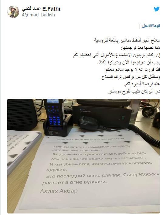 Bölgede Hafter için savaşan Wagner askerlerinin olduğu bilinirken, Rusça broşürlerde "Size verilen paranın tadını çıkarmak istiyorsanız, geri çekilin. Silah bırakmayan herkesi öldüreceğiz" uyarısı yer aldı.