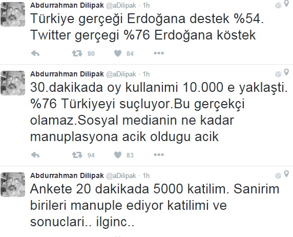 Dilipak, paylaştığı ankete yapılan manipülasyona karşılık, "Ankete 20 dakikada 5000 katılım. Sanırım birileri manipüle ediyor katılımı. Ve sonuçları ilginç... 30. dakikada oy kullanımı 10.000'ne yaklaştı. %76 Türkiye'yi suçluyor. Bu gerçekçi olamaz. Sosyal medyanın ne kadar manipülasyona açık olduğu açık. Türkiye gerçeği Erdoğan'a destek %54, Twitter gerçeği %76 köstek. Demek ki bu konularda hazır kıta bekleyen siber timler var. İşaret verildiği an saldırıyorlar. Sanal kişiler üzerinden tercihte bulunuyorlar" ifadelerinde bulundu.