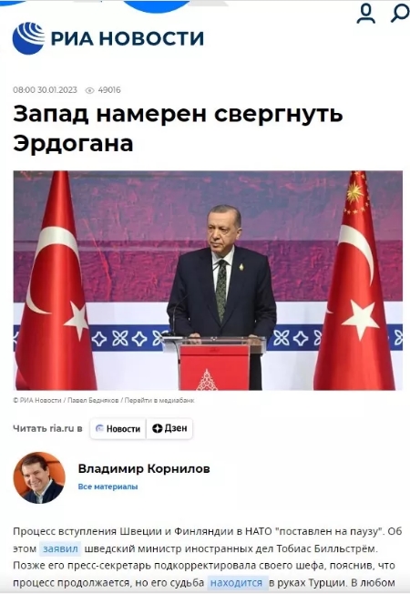 Rus devlet haber ajansı RIA Novosti’den Vladimir Kornilov, "Batı, Erdoğan’ı devirmek istiyor" başlıklı bir yazı kaleme aldı.