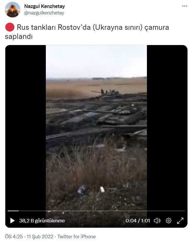Tamgatürk'te yer alan habere göre, Kazakistanlı gazeteci Nazgul Kenzhetay, Ukrayna sınırında bulunan Rostov'da çamura saplanan Rus tanklarının görüntülerini Twitter hesabından aktardı.