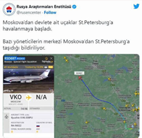 Rusya Araştırmaları Enstitüsü'den yapılan paylaşımda; "Moskova’dan devlete ait uçaklar St.Petersburg’a havalanmaya başladı. Bazı yöneticilerin merkezi Moskova’dan St.Petersburg’a taşıdığı bildiriliyor." ifadeleri kullanıldı.