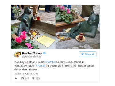 Nitekim Rusya'nın Ankara Büyükelçiliği de heykelin çalınmasına tepkisiz kalmadı. Büyükelçilik'in Twitter hesabından yapılan açıklamada "Kadıköy'ün efsane kedisi #Tombili'nin heykelinin çalındığı yönündeki haber, #Rusya'da büyük yankı uyandırdı. Ruslar da bu durumdan rahatsız" denildi.