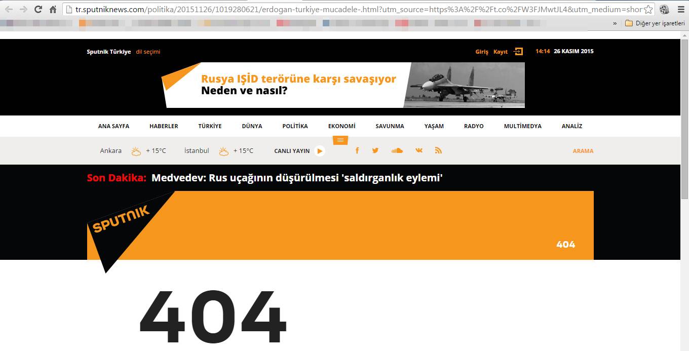 Rus haber ajansı Sputniknews'in Türkçe yayın yaptığı internet sitesi, Cumhurbaşkanı Erdoğan'ın konuşmasını canlı yayınlarken, Rusya'ya yönelik eleştirilerinden dolayı haberi yayından kaldırdı.
