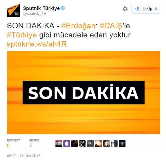 Rusya'nın Türkçe yayın yapan ajansı Sputniknews, Cumhurbaşkanı Recep Tayyip Erdoğan'ın muhtarlar konuşmasını canlı yayınlarken, Erdoğan'ın Rusya'ya yönelik eleştiri ifadeleri nedeniyle yayını keserek haberi sildi.