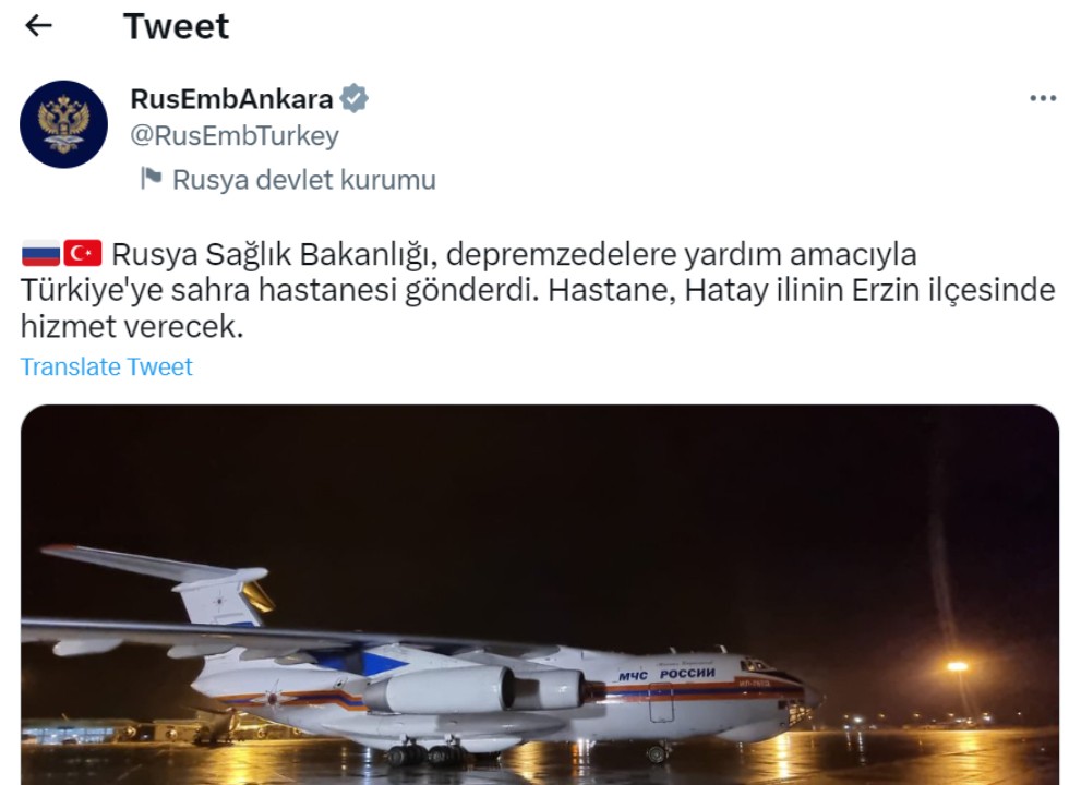 Türkiye'ye destek için gelen Rus kurtarma ekipleri dışında Rusya'dan sevindiren haber geldi. Rusya'nın Büyükelçiliği Twitter'dan duyurdular: Rusya'nın Ankara Büyükelçiliği, Rusya Sağlık Bakanlığı'nın depremzedelere yardım amacıyla Türkiye'ye sahra hastanesi gönderdiğini bildirdi.