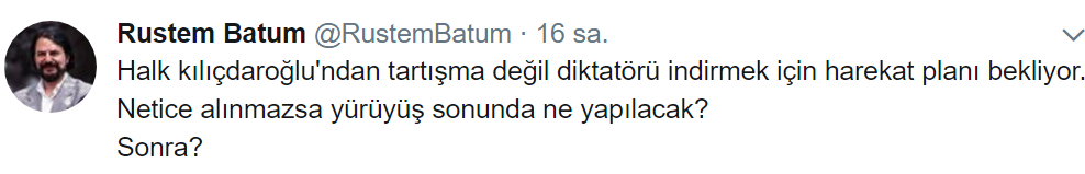 YENİAKİT.COM.TR - ‘Haçlı zihniyetinin artıklarından’ Rüstem Batum, Fetullahçı Terör Örgütü ile aynı söylemlerde bulunan CHP Genel Başkanı Kemal Kılıçdaroğlu'ndan seçilmiş AK Parti hükümetine ve seçilmiş cumhurbaşkanına darbe yapmasını beklediğin söyledi. Sosyal medya hesabından yaptığı açıklamalarda Kılıçdaroğlu’nun başlattığı sözde ‘adalet’ yürüyüşüne arka çıkan Batum, darbe seviciliğini açık açık paylaştı. Twitter hesabından bir mesaj yayınlayan Batum, “Halk kılıçdaroğlu'ndan tartışma değil diktatörü indirmek için harekat planı bekliyor. Netice alınmazsa yürüyüş sonunda ne yapılacak?” ifadelerini kullandı. Bu sözler sonrası Batum’un 15 Temmuz hain darbe girişimini başlatan FETÖ ile ilişkisi olup olmadığı merak konusu oldu.