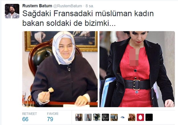 Sosyal medyada yaptığı skandal paylaşımlar ile zaman zaman gündeme gelen ve yorumcuların ‘haçlı artığı’ diye söz ettiği Rüstem Batum, 7 Haziran seçimleri sonrası kurulan geçici seçim hükümetinde Aile ve Sosyal Politikalar Bakanı olarak atanan Ayşen Gürcan’ın başörtüsünden rahatsız olmuştu. Batum, Gürcan’ın tesettürlü fotoğrafı ile Fransız bir bakanın dekolteli müstehcen fotoğrafını ‘Sağdaki Fransa’daki Müslüman kadın bakan soldaki de bizimki...’ mesajıyla birlikta paylaşmış ve aklı sıra tesettürü aşağılamıştı.