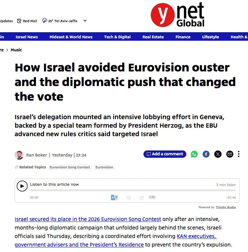 Yahudi gazetesi ynet’in haberine göre İsrail özel bir ekip kurdu ve EBU kararı öncesi düzenleme komitesi üyelerini mankaja aldı. “İsrail, Eurovision’dan elenmekten nasıl kurtuldu ve oylamayı değiştiren diplomatik hamle” başlıklı haberde “İsrail heyetinin, EBU’nun İsrail’i hedef aldığını söyleyen eleştirmenlerin öne sürdüğü yeni kuralları ilerletmesiyle birlikte, Cumhurbaşkanı Herzog tarafından oluşturulan özel bir ekibin desteğiyle Cenevre’de yoğun bir lobi faaliyeti başlattı” denildi.
