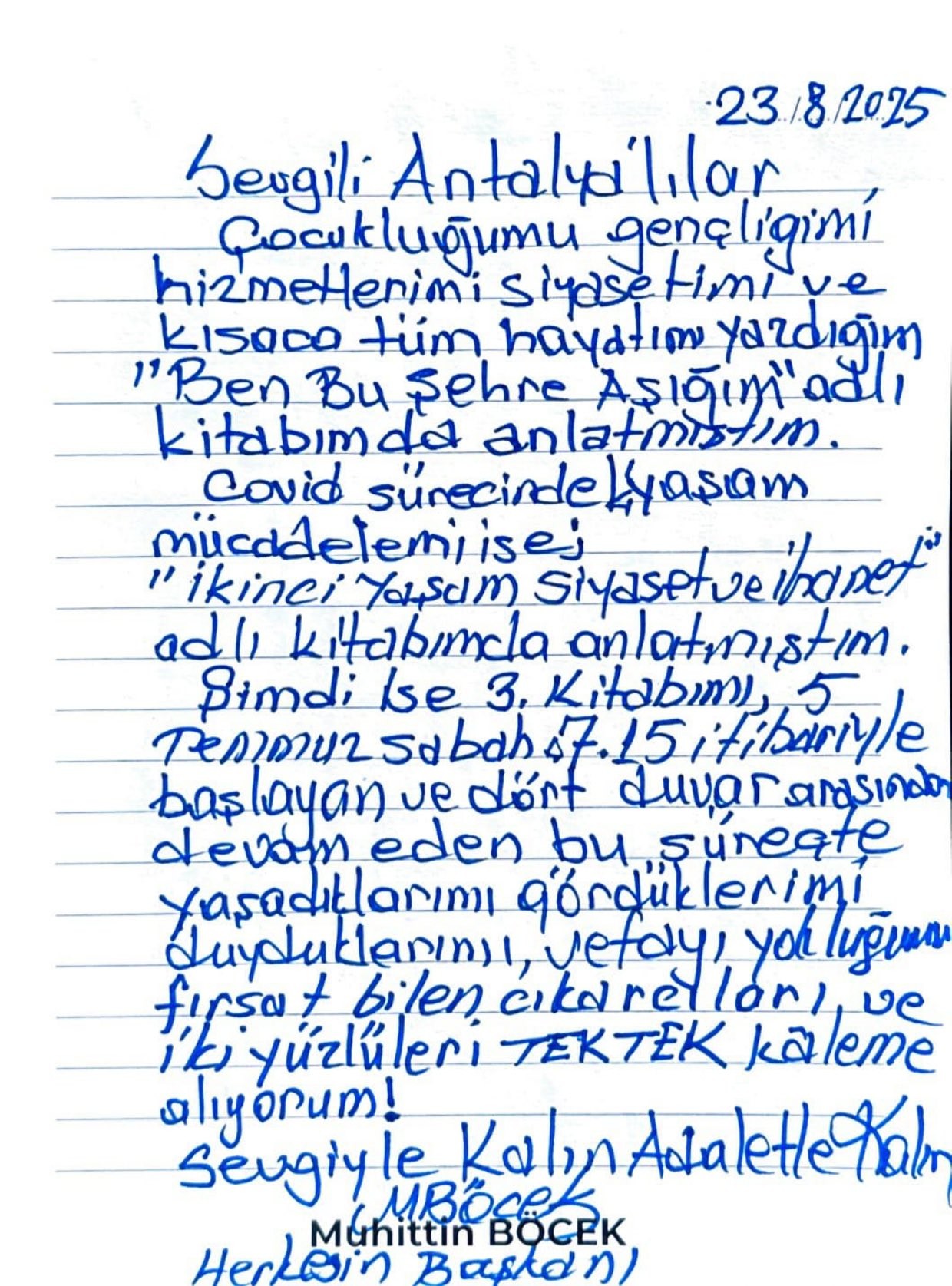 Rüşvet soruşturması kapsamında 5 Temmuz Cumartesi günü tutuklanan ve Döşemealtı L Tipi Cezaevi’ne gönderilen Antalya Büyükşehir Belediye Başkanı Muhittin Böcek, sosyal medya hesabından kendi kalemiyle bir mektup paylaştı. Yaşamı boyunca yazdığı iki kitap hakkında bilgiler paylaşan Böcek, üçüncü kitabını da cezaevinde yazdığını aktardı.