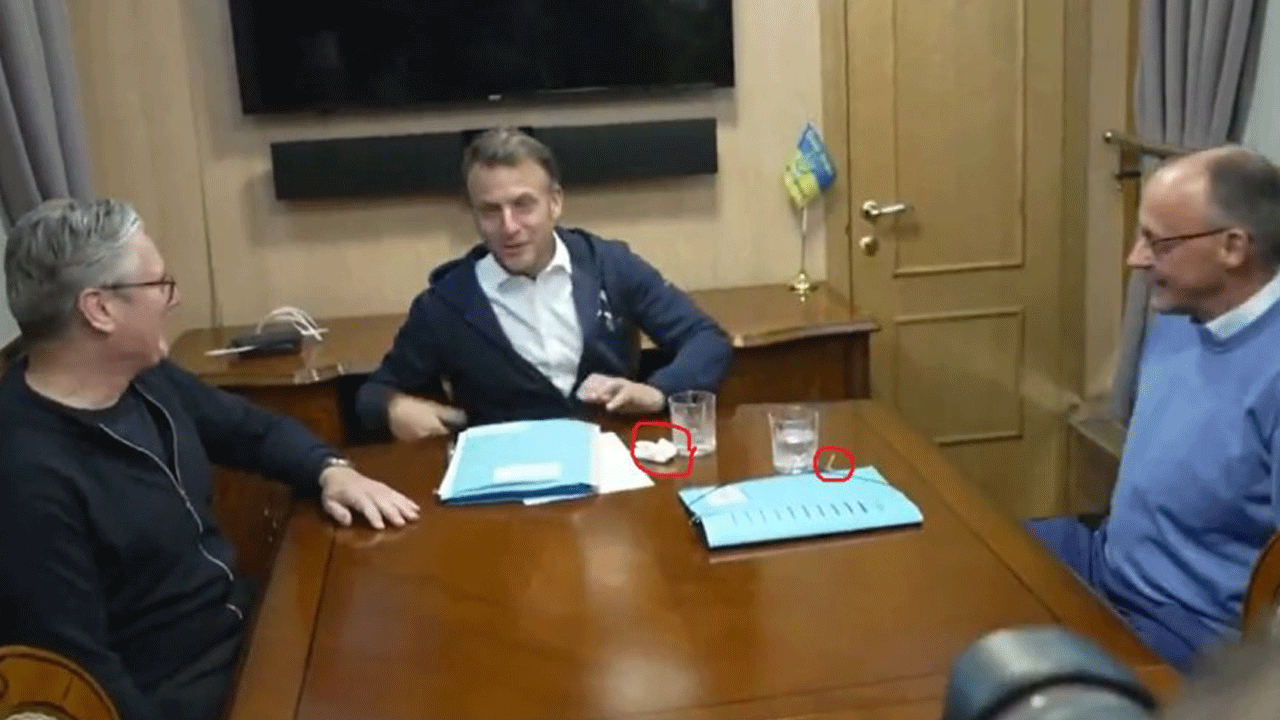 Zaharova, Telegram kanalından paylaştığı görüntüde, Fransa Cumhurbaşkanı Emmanuel Macron, Almanya Başbakanı Friedrich Merz ve İngiltere Başbakanı Keir Starmer yer alıyor. Görüntüde, Macron'un masa üzerindeki beyaz renkteki maddeyi eliyle sakladığı görülüyor.