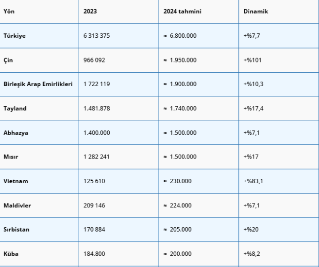 ATOR'un analizlerine göre 2024 yılında Ruslar, turizm için en önemli 20 yabancı ülkeye yaklaşık 17,35 milyon seyahat gerçekleştirdi.